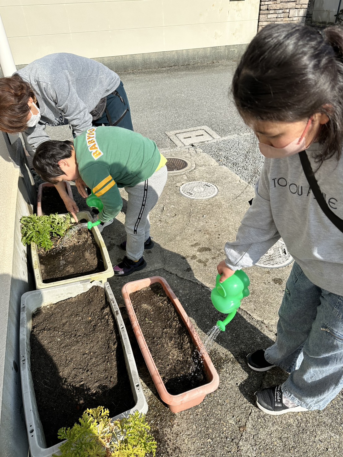 「春にチューリップが咲きますように」とみんなの願いをこめてお水をあげてました。子どもたちのパワフルなエネルギーがきっとチューリップとムスカリに届くと思います!