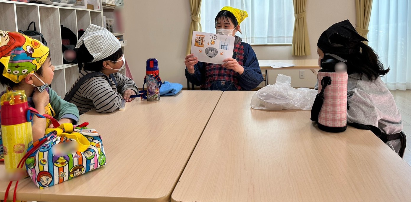 クッキングをする前に、スタッフから作る工程を聞きました。子どもたちは準備バッチリです✨