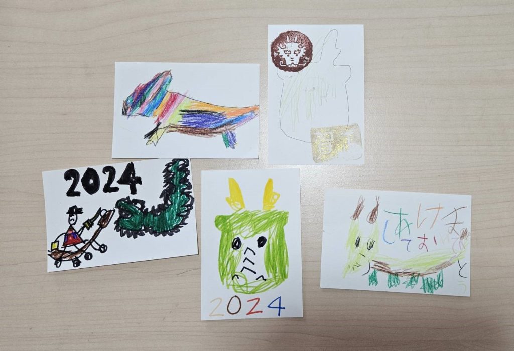 ニュース 2023/12/22 みんなの思いが届きますように 郵便局で年賀状を買いました。 子どもたちは祖父やいとこ、学校の先生や友だちなどに宛てて描きました。 「かっこいい竜を描くぞ!」 スタンプをギューッと押しました。 「どんな模様が出来るかな?」 みんなの年賀状が届きますように。