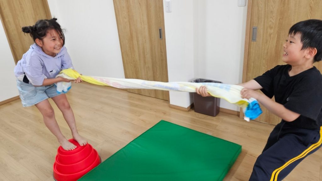 ニュース 2024/06/07 心を燃やせ!真剣勝負! パレットでは日頃から色々な真剣勝負が繰り広げられています。 最近の子どもたちのブームは「引っ張り相撲」です。 サーキットの上に立ってタオルを持ち… 「はっけよい、のこった!」 「絶対に勝つ!」と子どもたちの闘志に火が付き、互角の勝負が繰り広げられました。