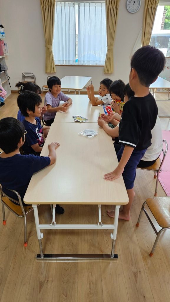 ニュース 2024/08/01 笑顔の輪が広がりました☺ パレットの子どもたちにUNOのブームが到来しました! 「UNOをしよう!」と一人の子どもが言うと、「僕もしたい!」「私もしたい!」と輪が広がりました。 ゲームがスタートすると「どのカードを出そうか…」と心理戦が繰り広げられていました。 みんなで遊んだことで子どもたちに笑顔の輪が広がり、温かな時間を感じました。 これからもその時間を大切にしていきます☺